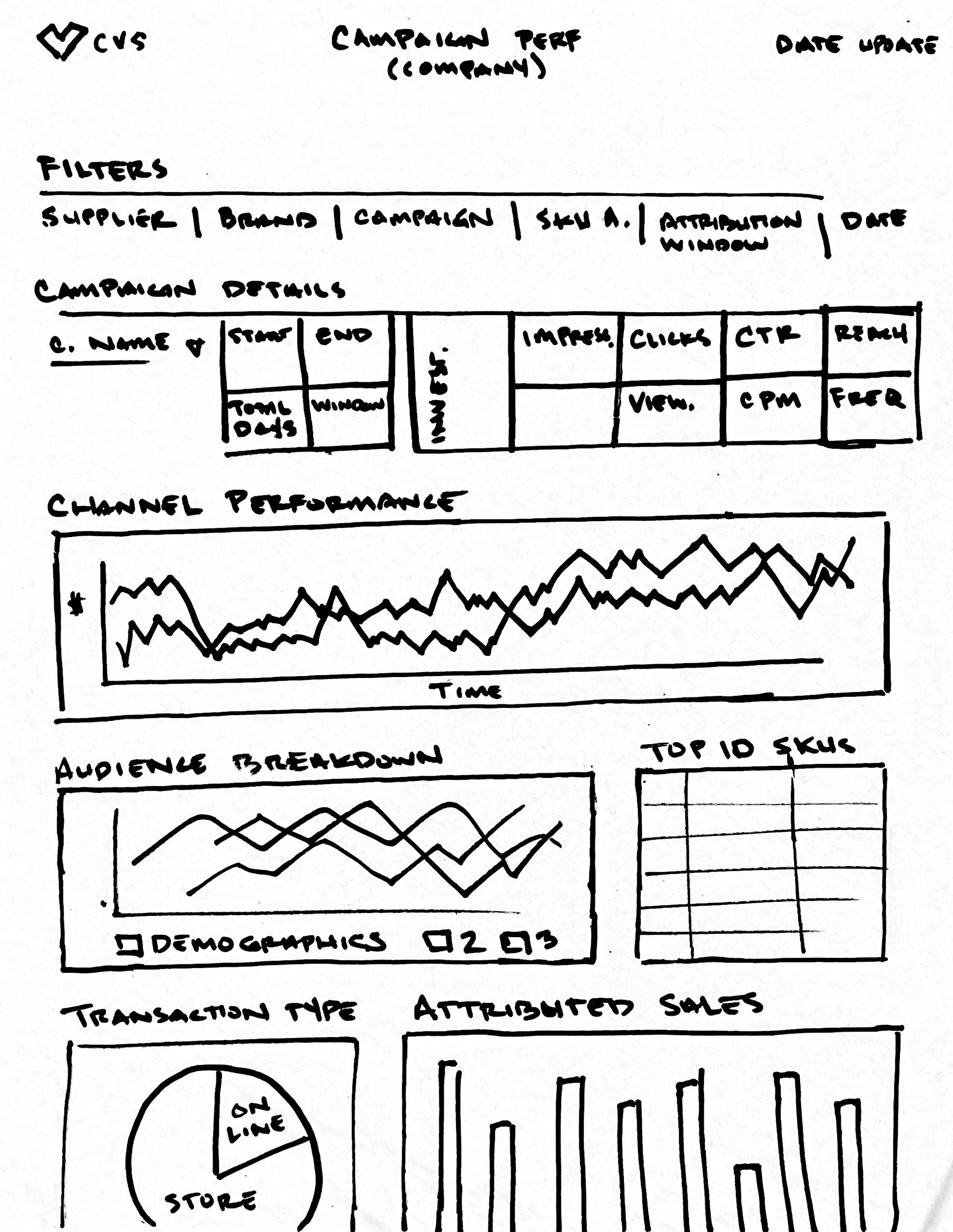 Kickoff: At the time of product kickoff, the CMX team shared their vision for a future state dashboard that could compete with rivals like Walmart Connect. We discussed features, what was in scope vs out of scope. When new metric data would become available, and general requirements. Although an existing CMX dashboard was already in use, user research was challenging. Not only did I lack direct access to users, or analytical tools that tracked their product usage, but I also had to rely solely on stakeholders and the CMX team to provide the voice of the customer.