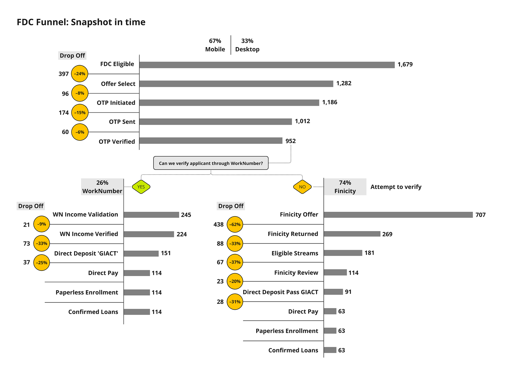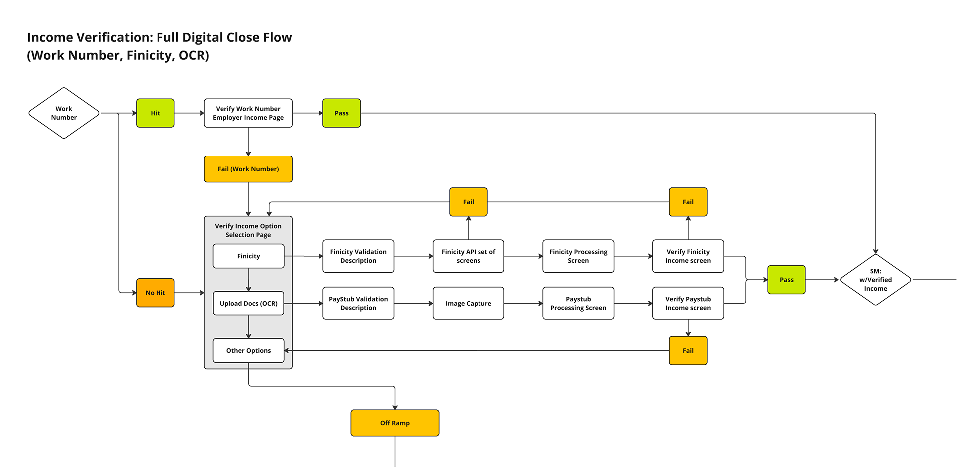 I created several process maps to document 1) How the back-end income verification process works. And 2) Pinpoint where users were dropping off along the sales funnel. Having a holistic view of verification and the sales funnel allowed our team to uncover and discuss a significant point-of-pains for many borrowers.