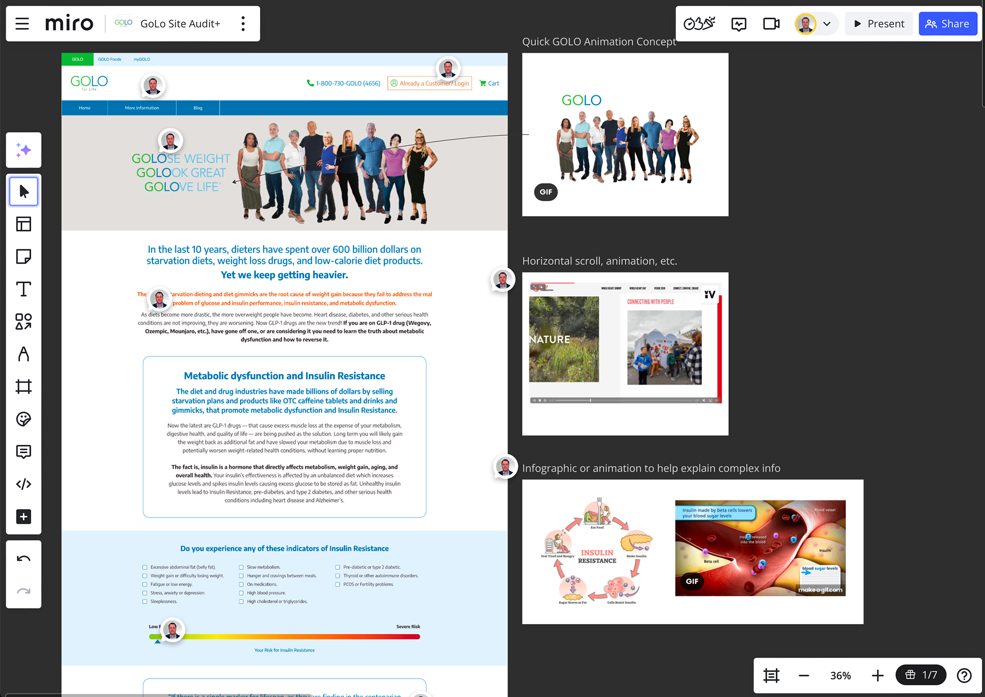 Throughout the site, I made suggestions to improve visuals and copy. On the main page for example, the static hero image amalgamates the logo with a marketing campaign to 'Lose Weight; Look Great; Love Life'. This might be better executed by adding a small animation of the logo separating to form each statement. Similarly, in a questionnaire section, I suggest that a smoother animated micro-interaction might support deeper engagement. Likewise, the use of a sticky button or additional 'Shop GOLO' buttons might help users to purchase with less friction. That introducing side scroll may help to breakup a long, drawn-out story. That accordions could help to hide extensive clinical trial copy not relevant to all users. And, including infographics and medical animations might help with user comprehension and messaging. These observations would be A/B tested for results.